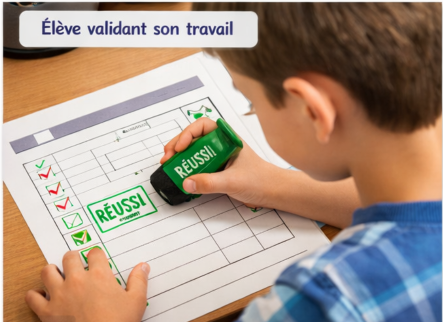 (Suggestion : élève cochant une case ou utilisant un tampon “réussi”.)
